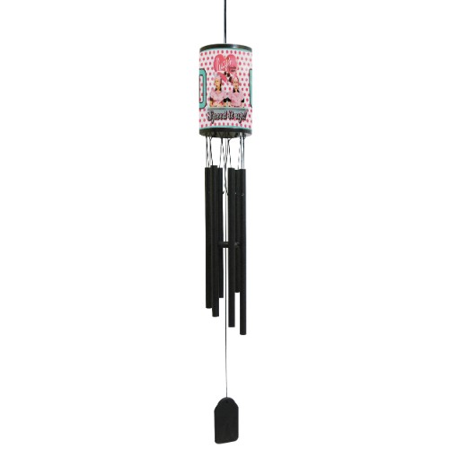 Each wind chime is all metal with a matte black finish. Totally weather resistant. Features 6 aluminum flutes for quality sound. Measures 33″ in length. Packed in a poly-bag with header card.